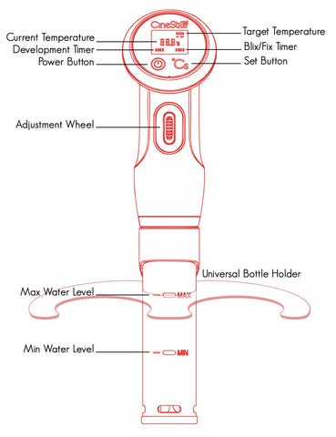 Intuitive Bedienungsoberfläche, voreingestellt auf die Standard-C-41-Verarbeitung, und leicht einstellbare Temperatur- und Zeitzähler für jede Verarbeitung.